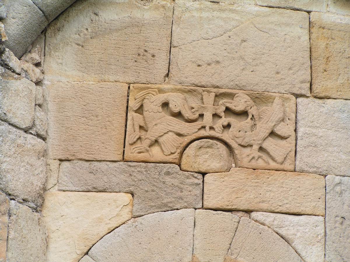 Saint-Julien-du-serre, Eglise, chevet, Plaque sculptee, 2 oiseaux et une croix.jpg