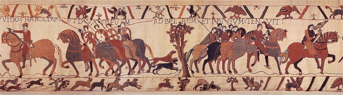 Le comte Guy, légitimement fier de sa "prise" et des richesses qu'il compte en tirer, chevauche en tête de sa troupe au coté de Harold, les deux seigneurs portant faucon au point.