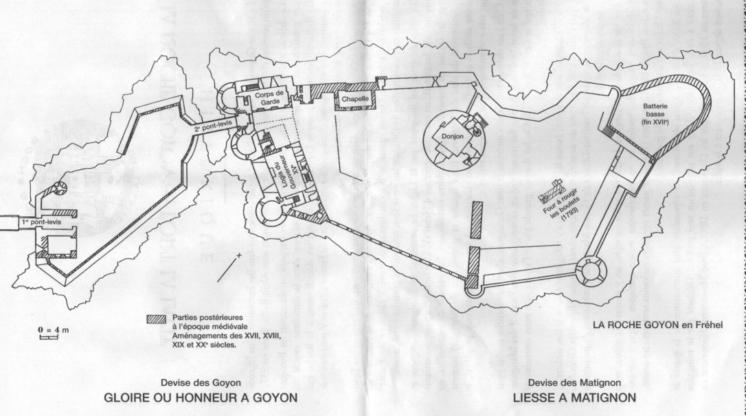 Au cours du XVe siècle, l'ascension sociale des Goyon se poursuivit. Ils figurent aux Etats de Bretagne. Un Goyon, chambellan du duc de Bretagne, épousera l'héritière de la baronnie de Thorigni-sur-Vire. La famille Goyon quitte le berceau breton et passe à l'histoire de France. Le château subit un nouveau siège (1490), anglais cette fois, sans succès pour les envahisseurs.
