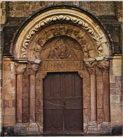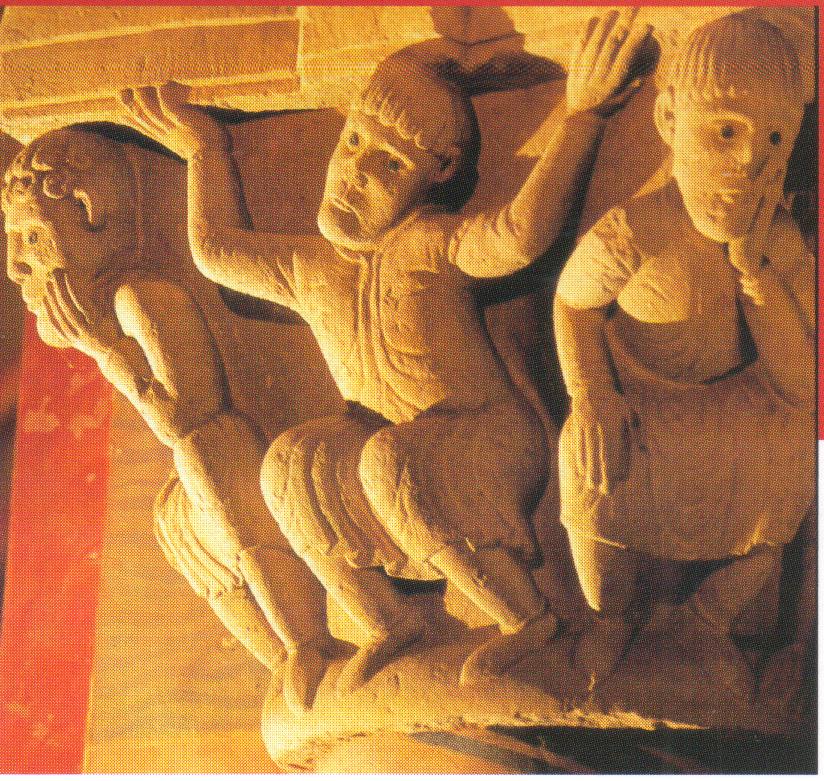 France, Saone-et-Loire, Anzy-le-duc, Chapiteau du choeur decore d'un atlante entre 2 hommes.jpg