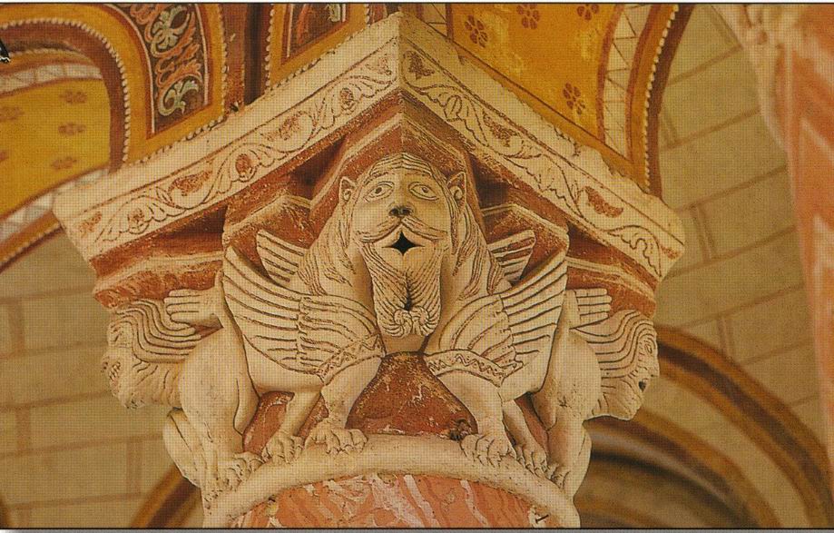 Ces chapiteaux déconcertent les historiens de l'art, qui n'arrivent pas à se mettre d'accord sur leur origine. Au point que l'on parle parfois du "maître de Chauvigny" qui les aurait sculptés. Ils ont des points communs avec d'autres chapiteaux du Val de Loire & du Poitou; un certain orientalisme transparaît aussi, puisque sur 4 d'entre eux se donnent libre cours toute les fantasmagories des palais mésopotamiens, lions & sphinx à têtes de femme ou d'homme barbu, dragons & autres animaux mythologiques, plus 2 rapaces épouvantables, un peu aigles, un peu vautours, pélicans par le bec, qui dévorent cruellement deux pauvres hommes.
