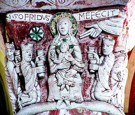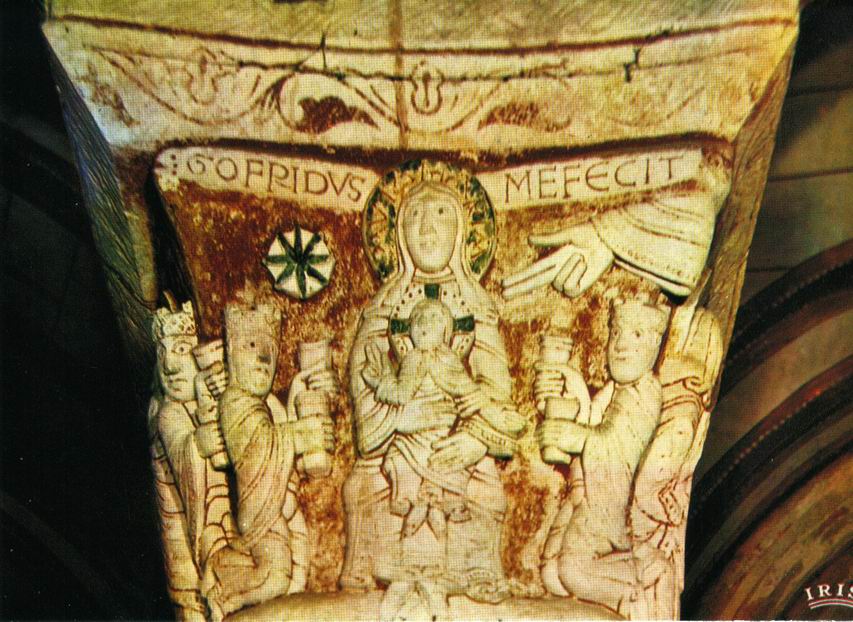 La particularité de ce chapiteau est d'être signé : Gofridus me fecit : c'est Godefroy qui m'a fait; c'est plutôt rare.