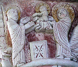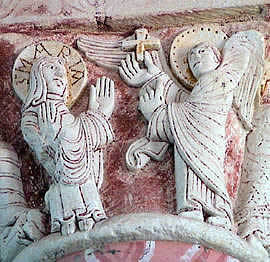 Deux chapiteaux historiés complètent la série, le premier christophanique avec l'Annonciation, l'Adoration des Mages (l'une des premières expressions romanes, sans doute, de cette scène, que les imagiers transporteront bientôt des chapiteaux aux tympans des portails), la Présentation, la Tentation du Christ.