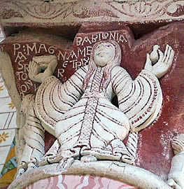 Elle se trouve sur un cul-de-lampe du côté Nord : elle tient deux oiseaux par le col. C'est un thème que l'on retrouve plusieurs fois en Poitou, & qui renvoie en général à la fée Mélusine.