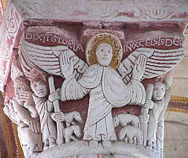 Un chapiteau historié est décoré "d'hystoires", i.e. de scènes de personnages empruntées à l'Ecriture Sainte (= la Bible), à la vie des saints. Ce type disparaît à l'époque gothique par suite de l'élévation de colonnes.