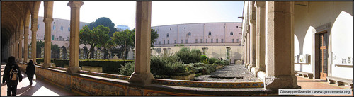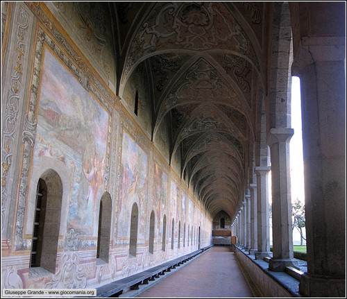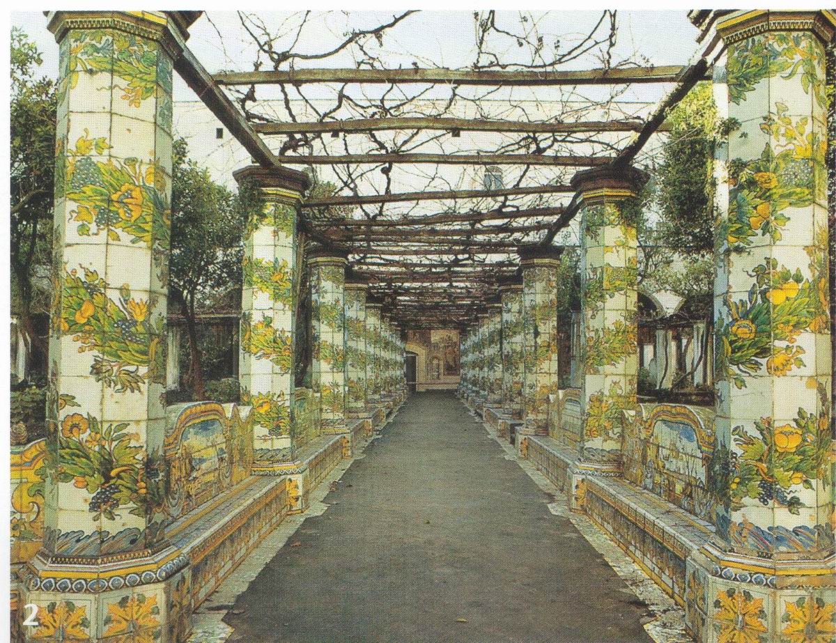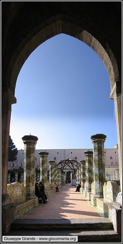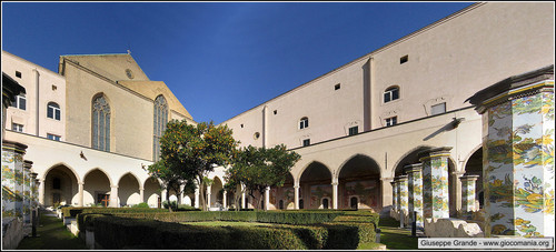 Si le monastère est bâti en 1310 sur ordre du roi Robert d’Anjou, un tremblement de terre (1456) obligera à le reconstruire entièrement. C’est chose faite dans la seconde moitié du XVIIIe siècle sous la direction de l’architecte Domenico Vaccaro, qui opte pour le baroque. Notez le beau portail en marbre polychrome embelli de frises sculptées. Nef dépouillée et flanquée de chapelles latérales pour la plupart du XIVe et du XVe siècle. Parmi les nombreux sarcophages du presbytère, voir celui de Marie de Valois réalisé par Camaiano au XIVe siècle. Derrière le chœur, admirez la sépulture de Robert Ier d’Anjou et ses vertus (XIVe). Le cloître des carmélites (entrée par la via Santa Chiara), quant à lui, est recouvert de majolique. De forme rectangulaire, long de 82 m et large de 78 m, 64 pilastres peints sur céramique en rythment l’espace. Les diverses scènes illustrent la vie quotidienne à l’extérieur du monastère. Notez l’omniprésence des quatre éléments naturels : l’air, l’eau, le feu et la terre. Un couple de paons entouré d’anges symbolise le triomphe de l’air. Neptune, dieu des océans, accompagné des tritons et autres néréides porteuses de corail et de fruits de mer, représente l’univers aquatique. Les deux femmes, présentes dans le carrosse conduit par quatre cavaliers, se veulent une allégorie de la terre. Elles se transforment d’ailleurs en fleurs, image de la fertilité.
