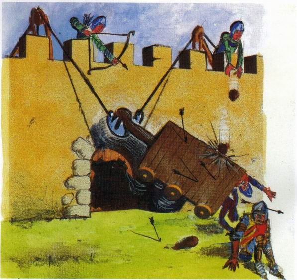 La louve a été imaginée par les assiégés pour contrer le travail de sape des béliers. Un crochet descendu au moyen de cordes permettait de saisir la tête du bélier.