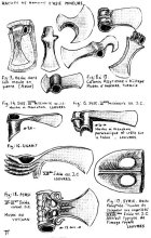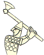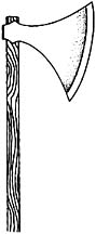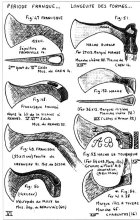 ![]() ![]() ![]() ![]() De gauche à droite: Francisque, hache danoise, Carolingien tenant une hache à deux mains, hache danoise |