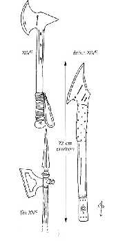 ![]() Hache de brèche Grande hache à deux mains utilisé pour l'assaut des brèches créées par l'assaillant. La grande hache nécessite de l'espace pour une bonne utilisation. Nombreuses formes du fer de combat existent. La longueur totale est variable suivant les exemplaires. |